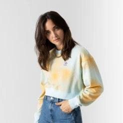 ConfectionnĂ© en coton biologique, ce sweat-shirt pour femme prĂ©sente une coupe ample, cropped tendance et confortable. HabillĂ© dâun design tie and dye bleu pastel et jaune, ce must have du vestiaire moderne vous garantit des looks hauts en couleur.