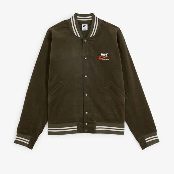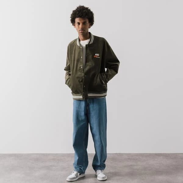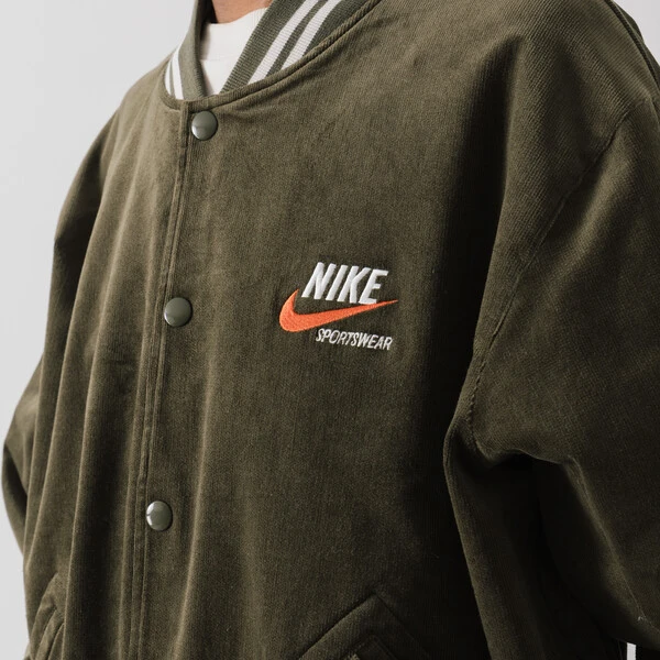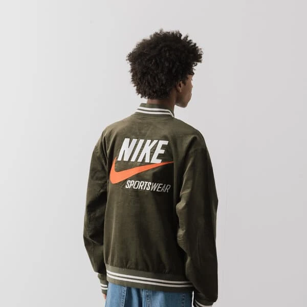 Optez pour une pièce mythique du vestiaire masculin et craquez pour une veste Bomber signée Nike. La Jacket Bomber Varsity présente un design vert kaki contrasté par des bandes blanches sur le col, les poignets et la taille. Retrouvez le logo à virgule brodé sur le cœur.